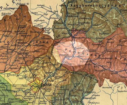 The city of Ungvar, now Uzhorod, is in the yellow area. Just to the northeast -- colored reddish-brown -- is the district labeled Perecsenyi after its principle town of Perecsen, today's Perec'yn, on the west bank of the Ung/Uz' River, across from the point where the east-to-west flowing Turja River joins it. Five miles east of Perecyn is Turjaremete/ Turji Remety/ Turja Remeta, at the point where the smaller Turica (=Little Turja) River joins the Turja from the north. A couple of miles up the Turica is the village of Nagyturjaszog, which was the Magyar/Hungarian name for the Rusyn village of Velyka Turycja, sometimes called simply Turycja.